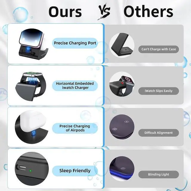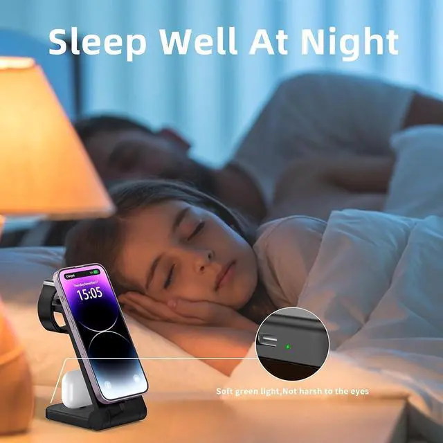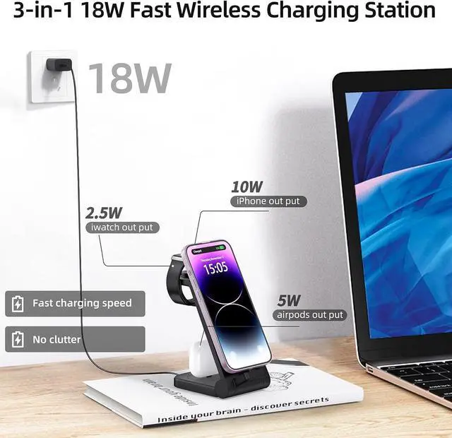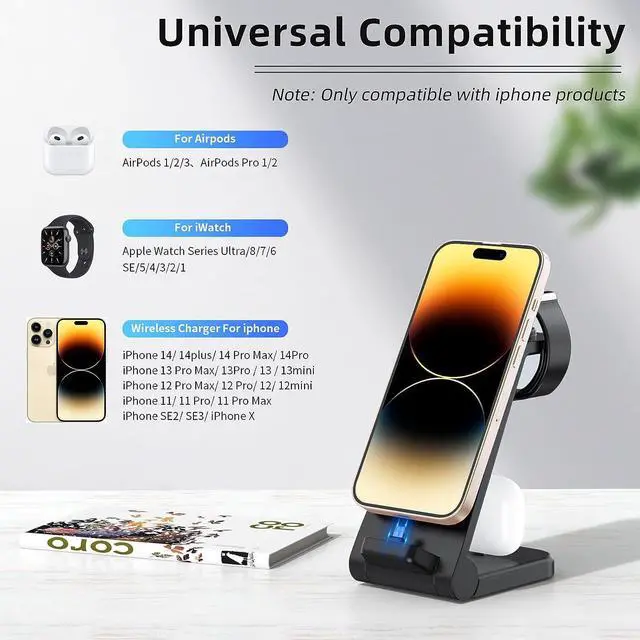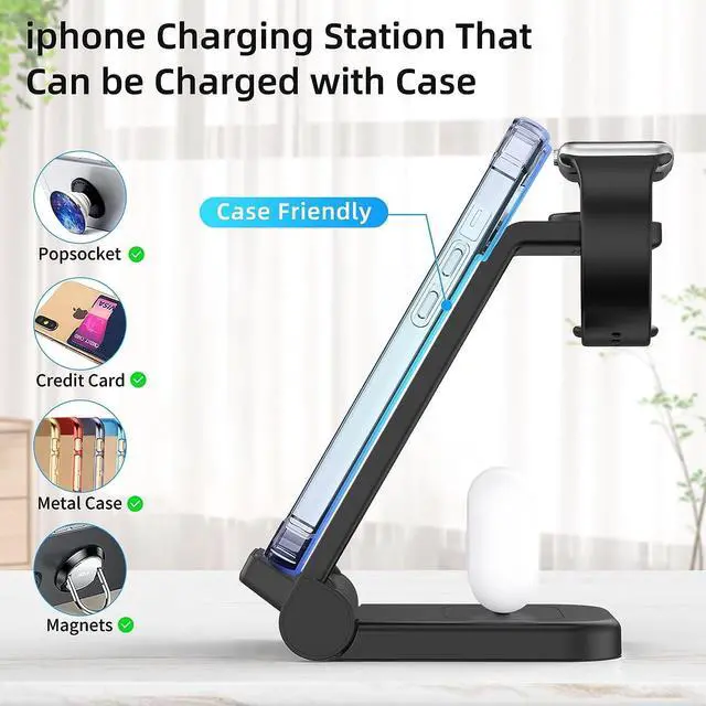 Our 3 in 1 charging station only needs one cable to charge your iphone, iwatch and airpods at the same time, avoiding the trouble of tangling multiple cables. This is a 3-in-1 smart charging product that simplifies your life and makes your desktop neater, and is the first choice for Apple users.
