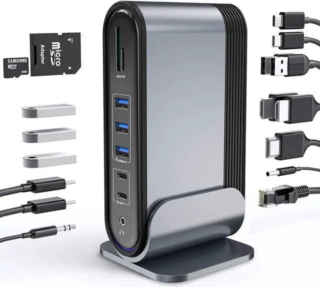 One-stop upgrade for your Windows tablet, laptop, or desktop. This USB-C Triple Display Docking Station provides convenient connectivity for an expanded workspace; connect a type-c laptop with up to 3 screens (3 HDMI), an Ethernet network, a Type-C PD port, a Type-C PC port, a DC power port, 2 Type-C ports, 3 USB3.0, 2 USB2.0, SD/Micro SD card reader, a 3.5mm Stereo Audio In & Out, all through a single USB-C cable.