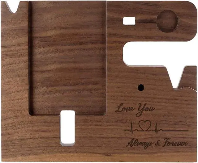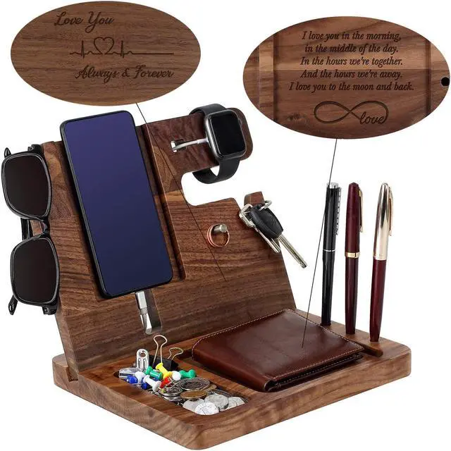 • SMOOTH & RETRO: Our wood docking station for men personalized is made of high-quality walnut wood with clear lines. It\u2019s surface is smoothly polished and covered with durable finishing, which feels smooth and comfortable to touch, with a marble-like texture, making it so comfortable to use. The carved text is recessed inwards, even if you don't have to look at it with your eyes, you can feel the emotions conveyed in the words. Perfectly fits into any interior-both classical and modern styles.