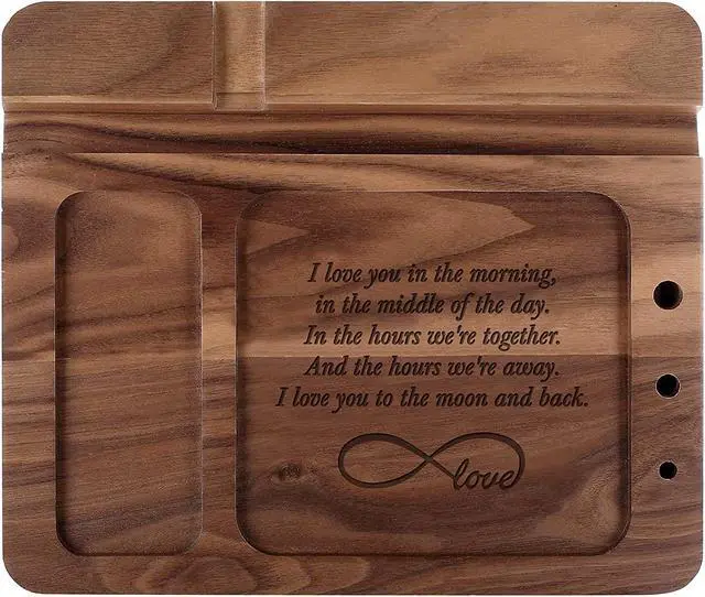 Every morning we are busy, trying to collect all the most needed daily items on desk will lose our precious minutes. With our wooden docking station all your accessories and gadgets will always be organized. Nightstand charging station is designed to hold and charge your phone. And it holds multiple accessories including but not limited to your keys, watches, ring, wallet, glasses, coins, pens, pencils, cards, headphones, necklace, bracelet, and jewelry to keep your space neat and clutter free. Each wooden phone docking station is handcrafted to create more sentimental value between our product and customers. The desk organizer is made of natural walnut wood which is durable against unintentional damage and resistant to decay. While at the same time, keeping that rustic and stylish look perfect for any setting. A variety of custom styles are available for you to choose. You can customize our wooden nightstand docking station to embody your love or care for your boyfriend, beloved, father, son and male friends in birthday, father's day, graduation, Christmas or any other holiday.