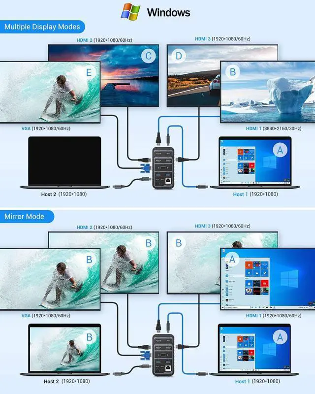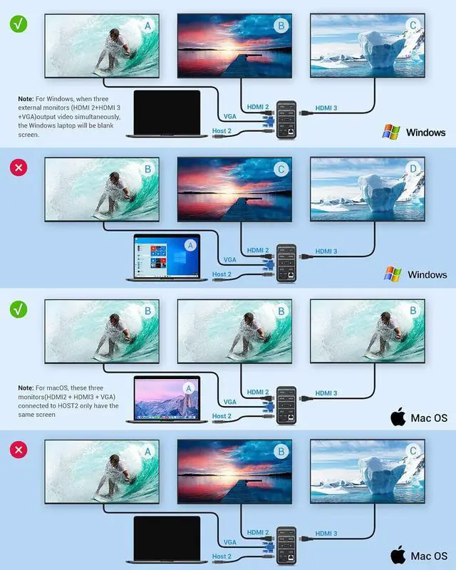 For Windows, EUASOO docking station supports Quadruple Display on 4 external monitors When connecting two host systems. HOST1 expand to HDMI1 monitor. HOST2 can expand to HDMI2 + HDMI3 + VGA, and support Triple display. Note: For HOST2, when three external monitors output video simultaneously , the Windows laptop will be blank screen.