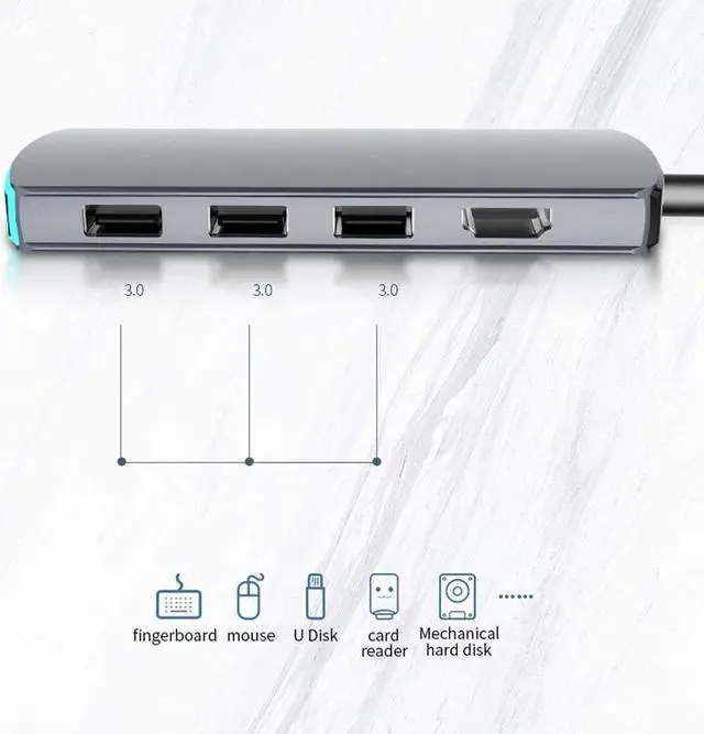 Output: USB3.0 x 3; HDMI x 1, support 4K HD video transmission, audio synchronization; USB-C PD x 1, 60W; 3.5mm audio x 1