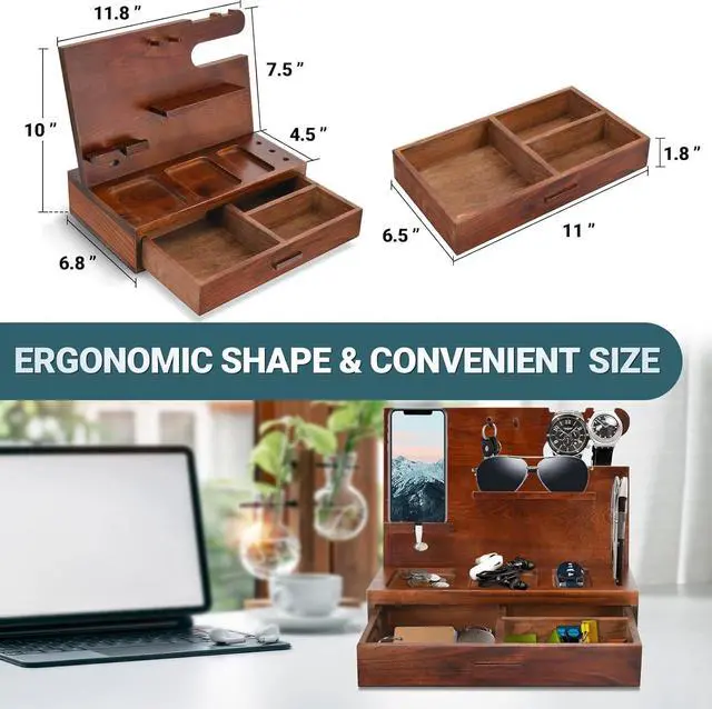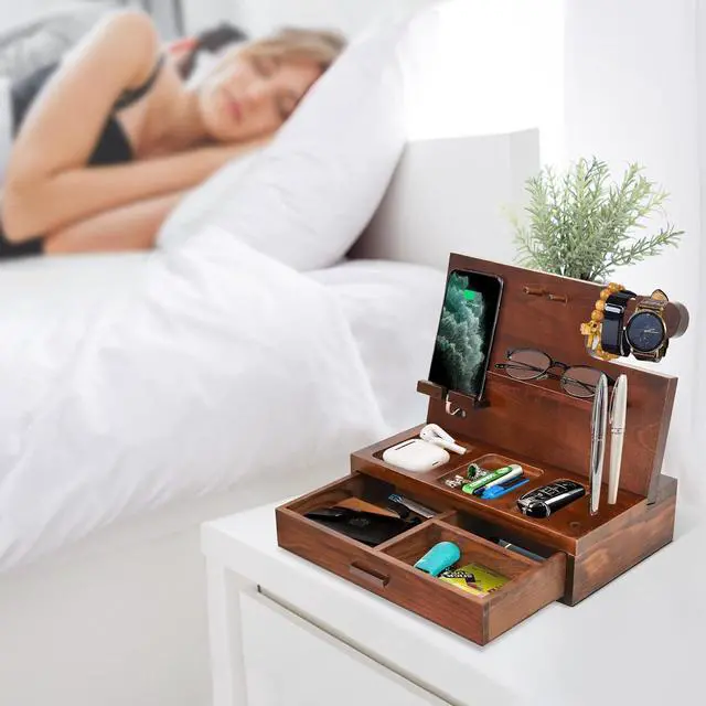 Wood Phone Docking Station,Nightstand Organizer for Men,Gifts for Men,Cell Phone Stand with Drawer,Watch Holder Wallet Station Key Holder Birthday Gifts for Dad,Bedside Table Organizer Dad's Gift