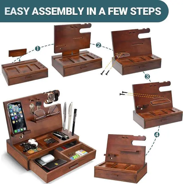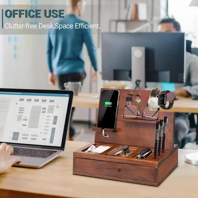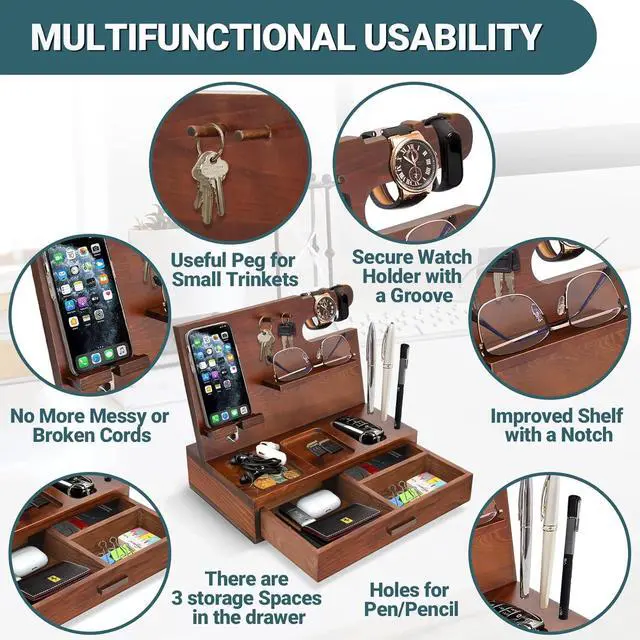 Phone Holder with Drawer: Your new phone docking station for men features a hidden drawer with 3 compartments to easily store and organize your small items including coins, rings, keys and anything else you want to keep safe and sound!