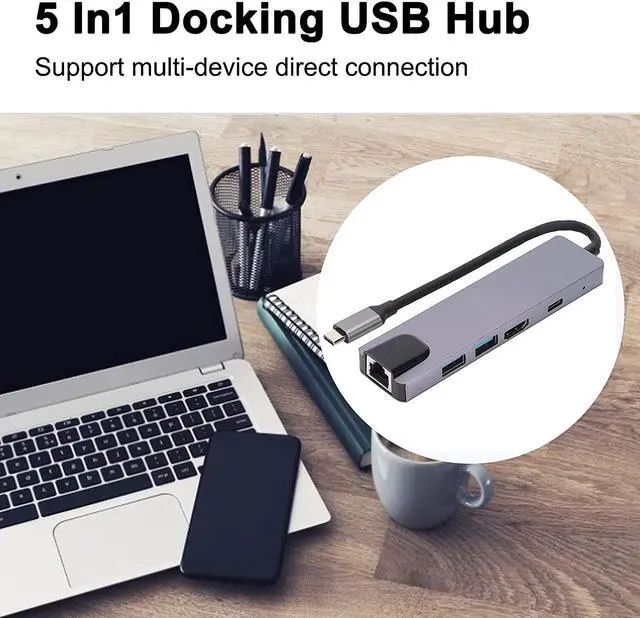 2. No driver or software is required, plug and play. Convert your usbc port into 5 ports: 2 x TypeC, 2 x USB2.0, HighDefinition Multimedia Interface, RJ45, Memory Card, Storage Card