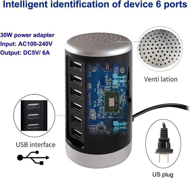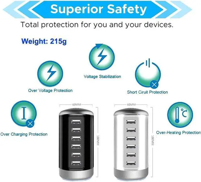 the safety of charging equipment. Centralize and organize your home or office with a single, power-saving 6-ports USB , quickly and easily with the smart USB ports.