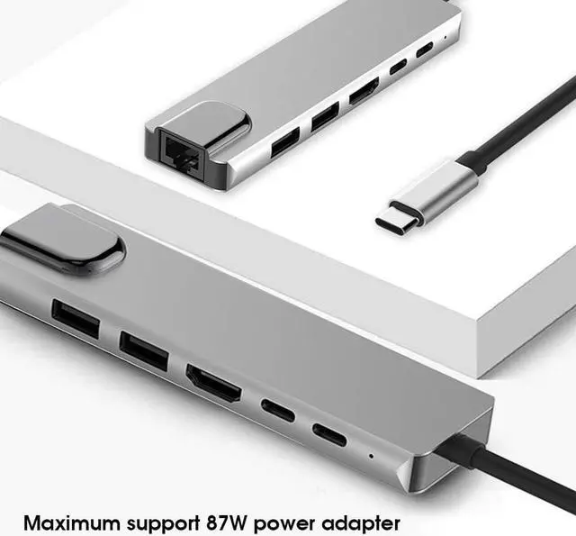 Multifunctional USB C docking station: USB C hub with 4K for HDMI video output, 2 USB3.0 master ports, 1000Mbps Ethernet adapters, and 2 USB C PD charging ports.