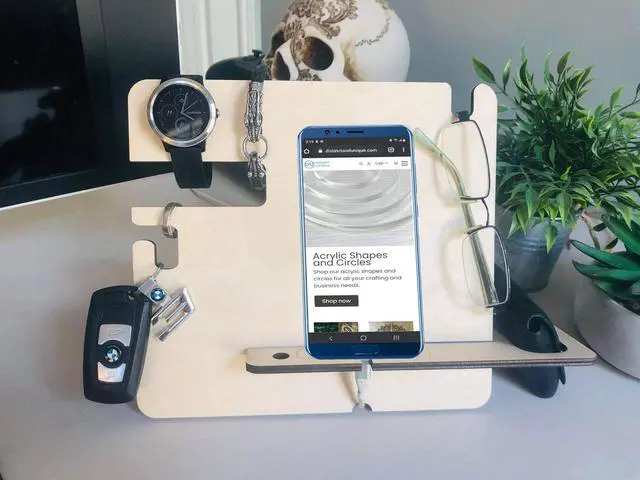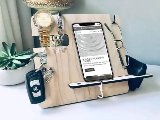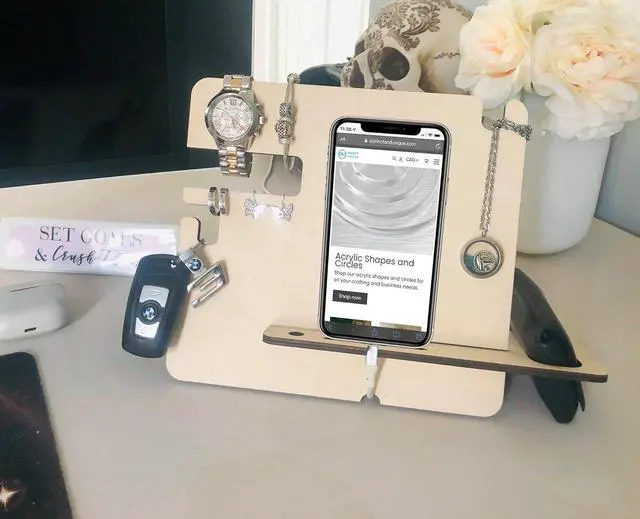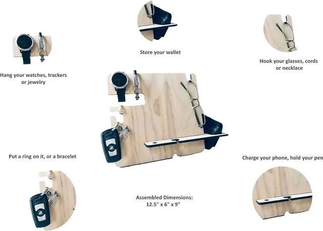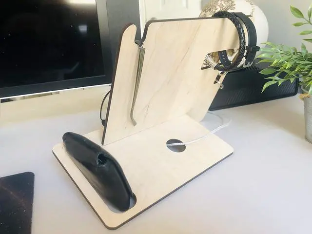 Looking for the perfect gift for yourself or someone special in your life? Then this Home Organizer / Cell Phone Charging station is perfect! Keep all you personal items neat and tidy with this cleverly designed stand. Made from high quality materials, this trinket holder is sturdy and stylish all at the same time and comes with everything needed to organize your life. It has a key holder, pen holder, ring holder, watch and wallet holder and a convenient cord opening to charge your phone.