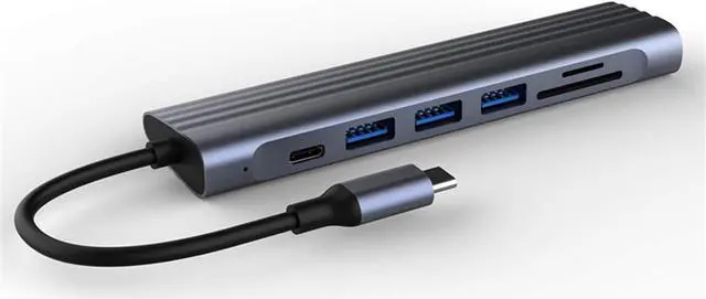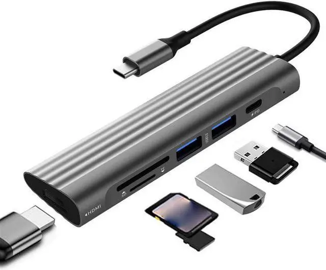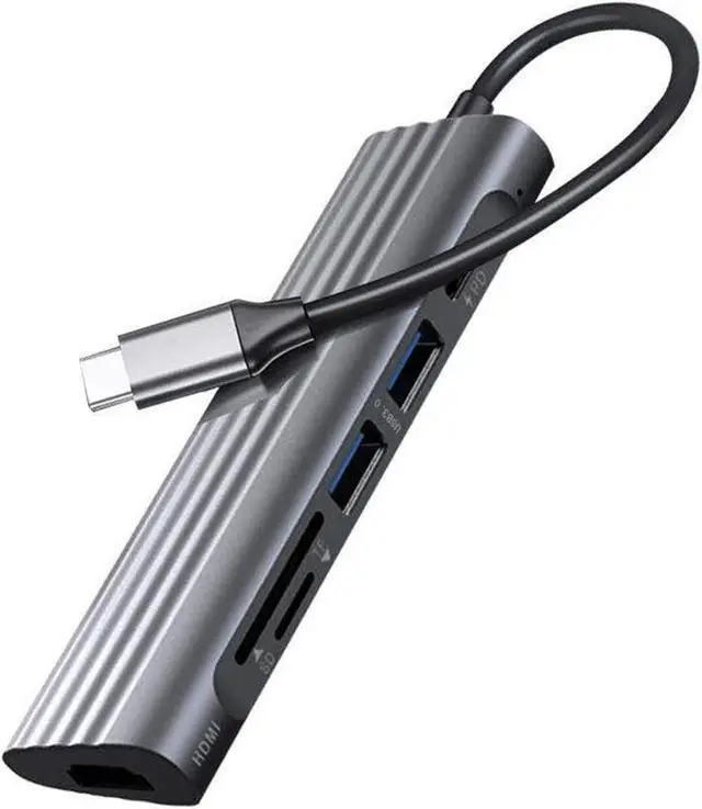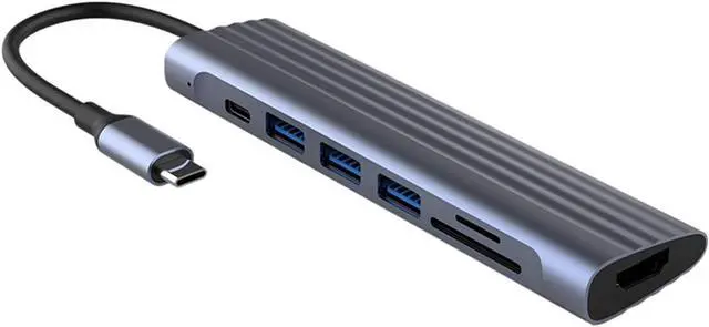 The docking station includes: 2 USB external ports, 1 Micro-SD card reader port, 1 SD card reader port, 1 PD charging port, 1 HDMI port