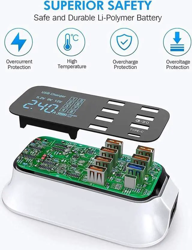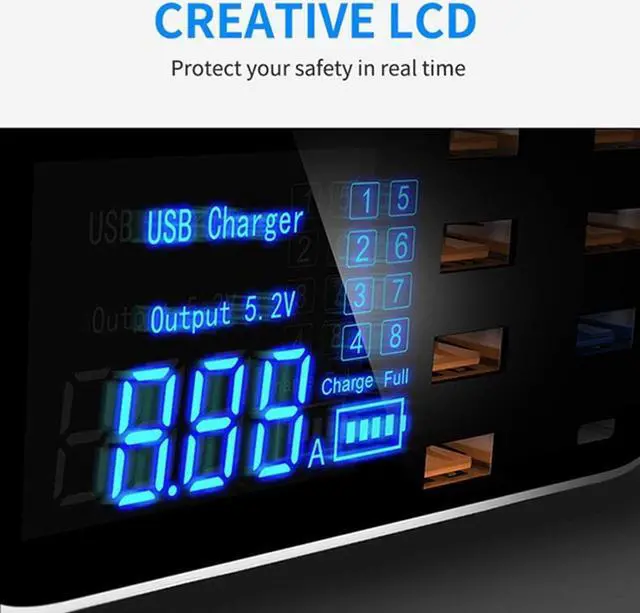 Read the charging status and data of every USB ports.Built-in power supply control IC, controls the rate of charging intelligently, fast and safe; Intelligent current distribution, the discharging current will change according to your devices