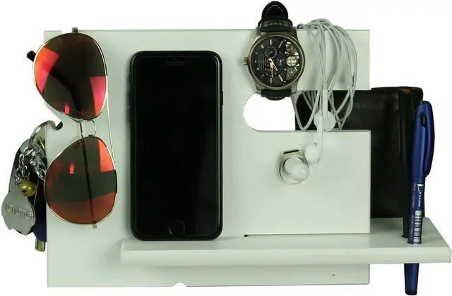 White Whale presents beautiful docking station. It has slots for key chains, glasses, sunglasses, necklaces, bracelets, bluetooth headset, or headphones. It can be used to cradle your phone while charging, and there is no need to unplug the phone and thread the charger through a hole. Just slide the cable through the slot. There is also a slot directly below the phone charging area to allow your charger cable to pass-through.