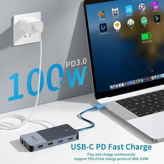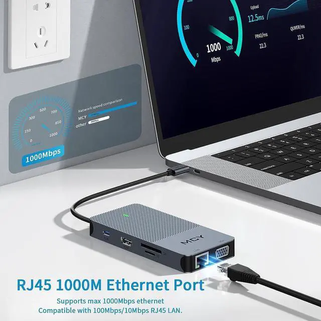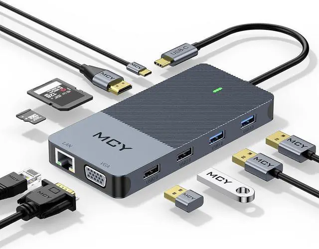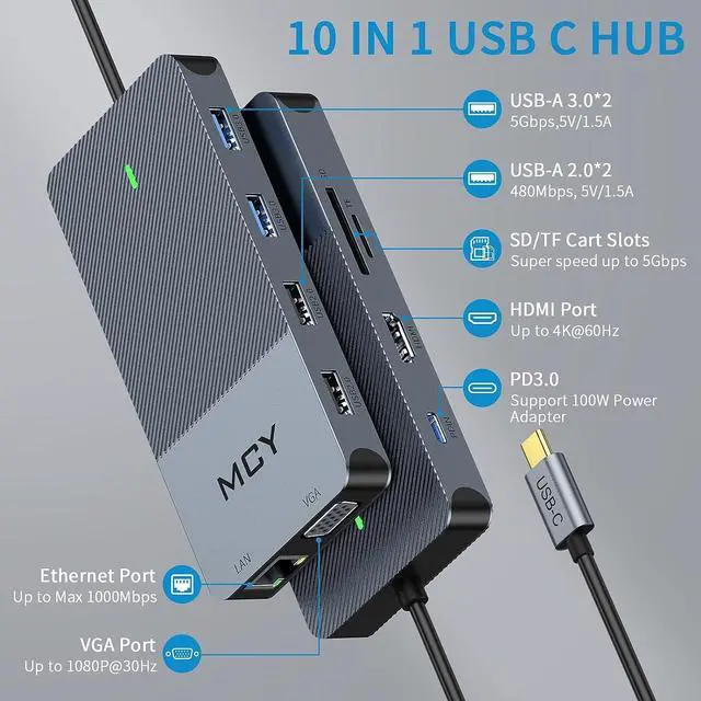 10 IN 1 USB C Docking StationMCY Type-C smart docking station can solve 10 kinds of office troubles at one time. USB C hub multiport adapter hub rich interface. HDMI makes the big screen clearer. 1G files are transferred in 3 seconds, and there is no need to wait for the transfer.