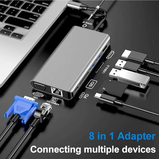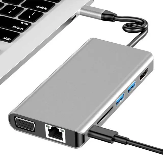 4. And typeC multifunctional docking station is with USB3.0 x 2 / memory card x 1 + / VGA + audio + RJ45 + Typec (power delivery) port.