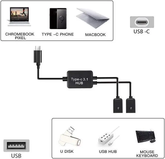 will take you to a colorful world, and make you feel surprising and cheerful every day. Type C OTG USB 3.1 Male to Dual 2.0 Female OTG Charge 2 Port HUB Cable Y Splitter