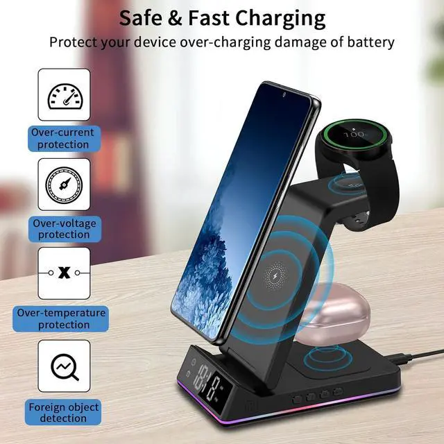 3 in 1 Wireless ChargerThis Samsung wireless charger has clock alarm and night light functions that other charging stations don't have, color LED charging indicator, foldable design, easy to carry. Specially designed for Samsung charging, can charge Samsung phone/Watch/Galaxy Buds at the same time. (includes QC 3.0 adapter)