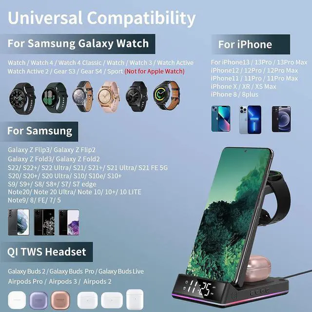 Universal CompatibilityThis Wireless charging station for Samsung Galaxy S22/S22 Ultra/S22 Plus/S22+/Galaxy Z Fold 3/Z Flip 3/S21 FE/S21 Ultra/S21+/S20/S20+/S20 Ultra/S10/S10+/S9/S8/Note 20/Note10+ etc. also suitable for iPhone 13/13 Pro/13 Pro Max/12/12 Pro/12 Pro Max/11/11 Pro/11 Pro Max/SE/XS/XS Max/X/XR/8 Plus/; for Samsung Galaxy Watch 5/Pro/4/3 Classic/3/1, Galaxy Watch Active 2/1; Compatible for Airpods 3/ 2/ Pro, Galaxy Buds 2/Pro/Buds Live.