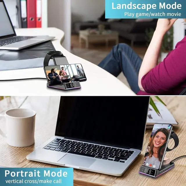 Fold Design and Clock/Alarm/Night LightThis 3-in-1 wireless charger has a foldable design, portable for travel or in a bag, one charging stand can charge multiple devices at the same time. In addition, also cloc