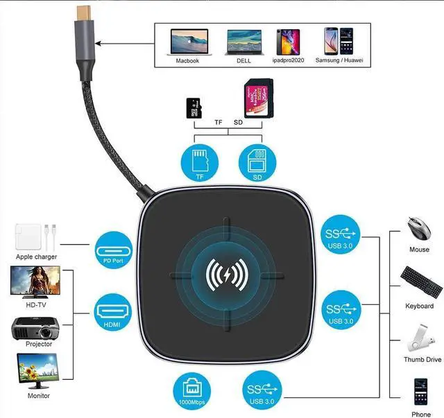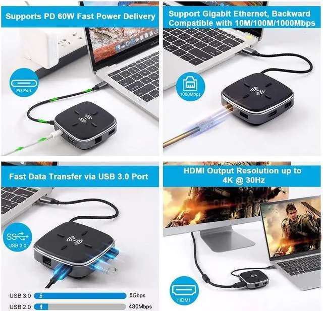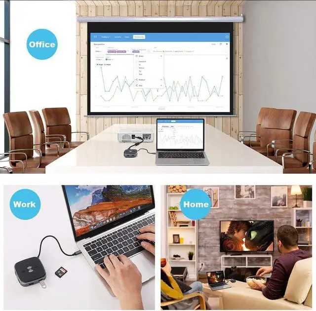 This multifunctional Type-C docking station can extend the Type-C interface to HDMI, USB3.0, RJ45 Gigabit Ethernet ports and card readers (TF/SD), etc. Enrich your computer connection ports and improve office efficiency. This product is very suitable for home audio-visual entertainment, teaching, training structure, office space, etc.