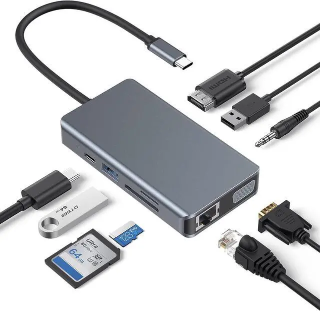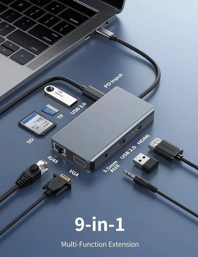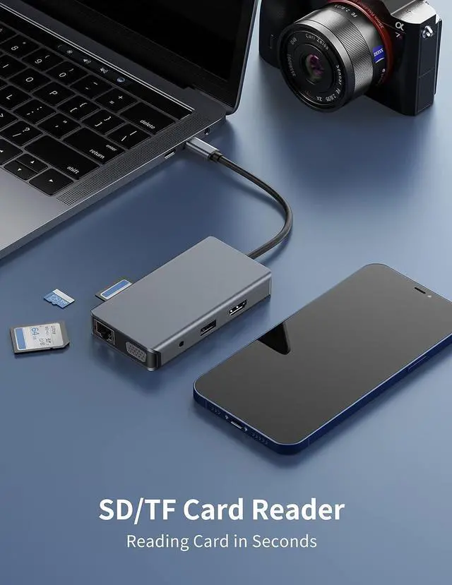 9 in 1 USB C Docking StationExpand the functionality of your laptop. This USB C Hub includes 1 4K HDMI port, 1 USB 3.0 5Gbps data port, 1 USB 2.0 port, 1 100W PD charging port, 1 SD/TF Card Reader, 1 3.5mm Audio interface, 1 VGA port, 1 RJ45 Ethernet port. Plug and play