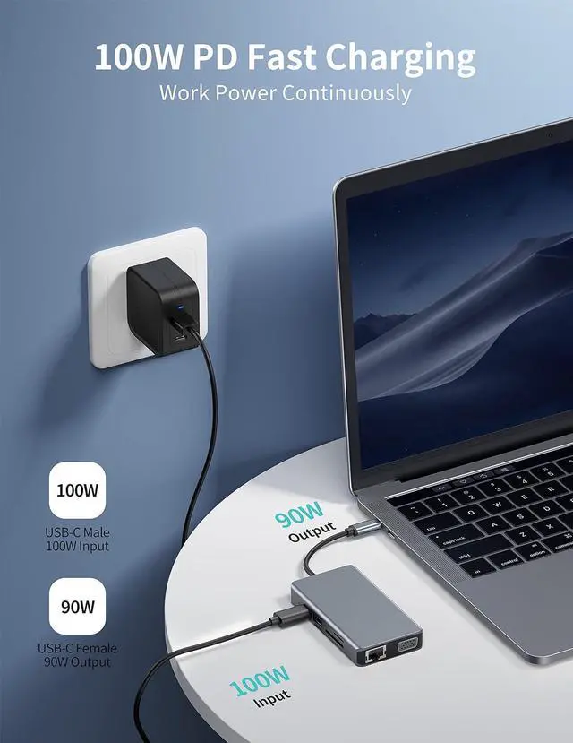 100W PD ChargingThe USB-C charging port supports 100W power delivery continuously. Hurple USB C Dock is safe for your laptop charging and working simultaneously with maximum output limited to 90W