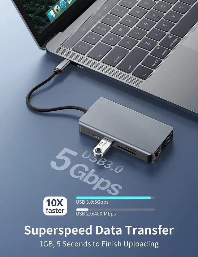 Fast Data TransferThe USB C 3.0 port of USB-C Hub has a data transfer rate of up to 5Gbps. 1GB HD movies or files, finish uploading in just 5 seconds. Besides, USB 2.0 port supports almost any USB peripheral device such as a hard drive, keyboard and mouse