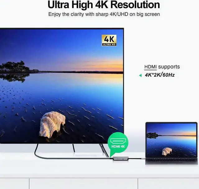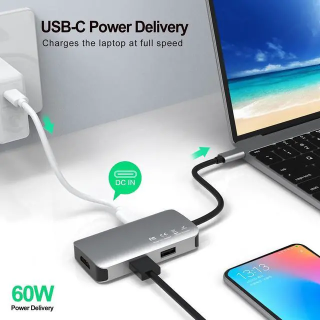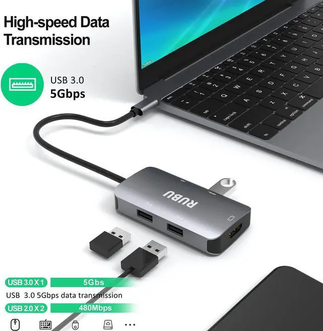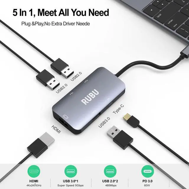 RUBU 5-in-1 USB-C Hubexpands the limited USB connectivity of your computer with an HDMI output port, a USB-C PD charging port, 1 USB 3.0 ports, and 2 USB 2.0 port.