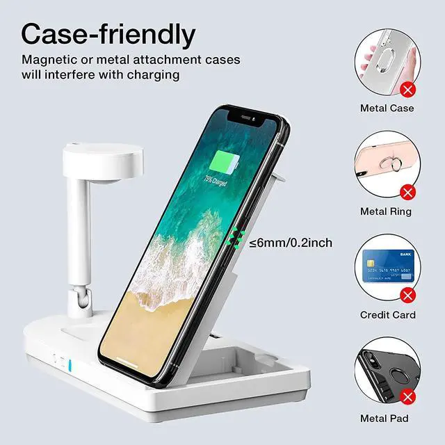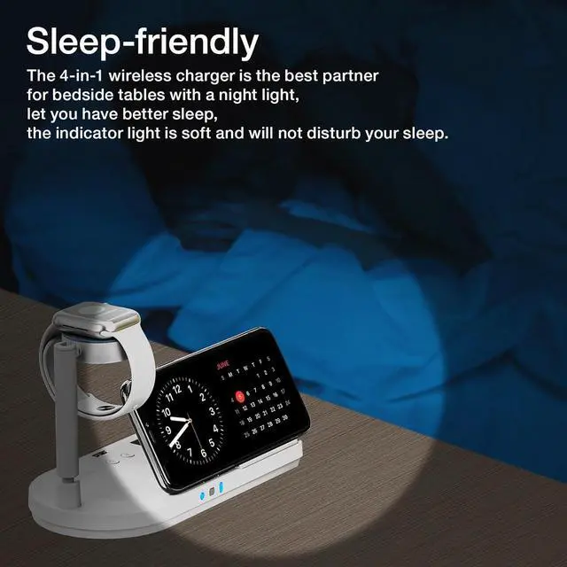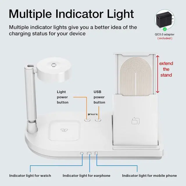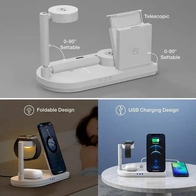 The wireless charger with a small and beautiful night lamp, you canplace on the bedside table next to the bed. The light is dim and softwhich will not affect your sleep. You can control the lights to turn onor off with buttons which help you have a better sleep.