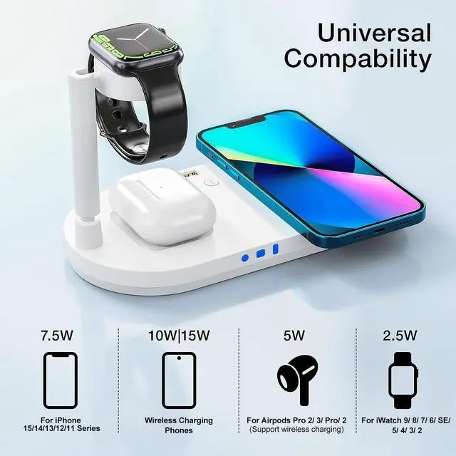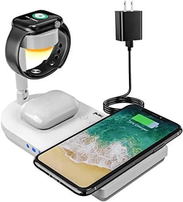 Portable 4 in 1 Charging Station for Apple Products, Wireless Fast Charger Stand with Bedside Lamp Compatible for iPhone 15/14/13/12/11 Series, AirPods Pro 3/2, iWatch 9/8/7/SE/6/5/4/3/2 (White)