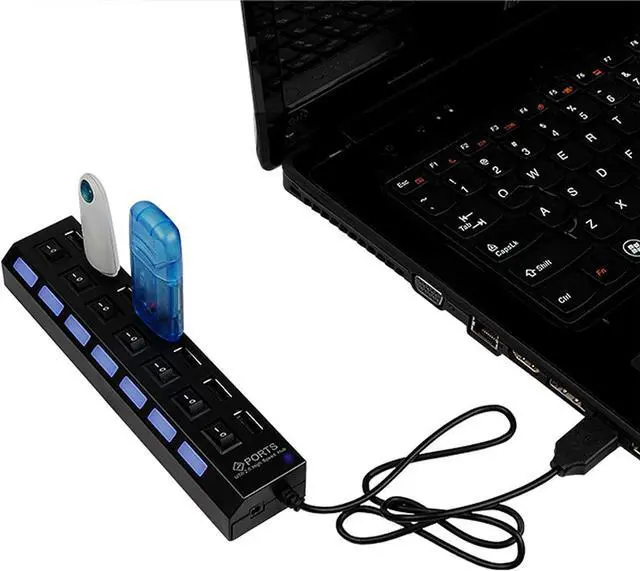 Expand your computer's connectivity with this 7 port USB hub with ON/OFF switch.