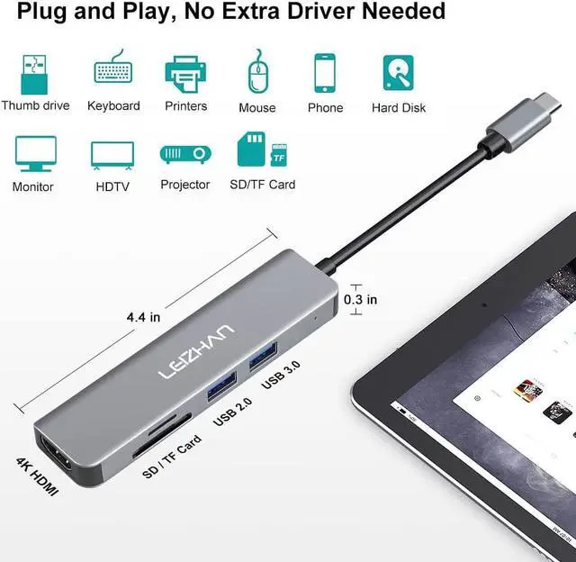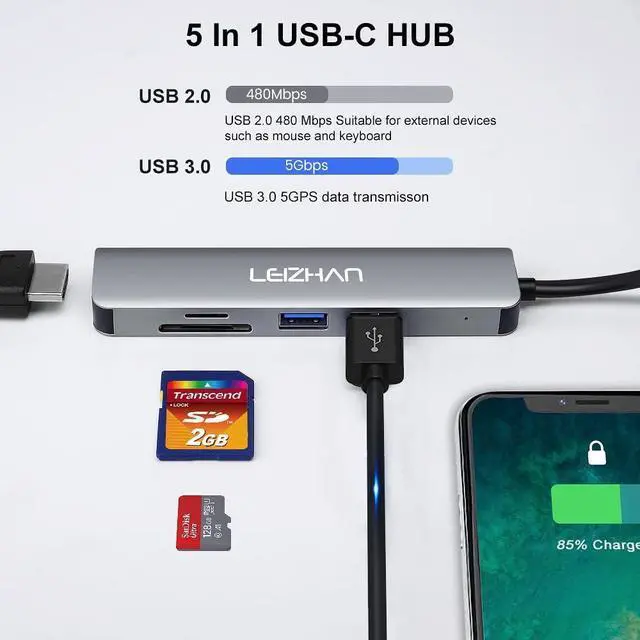 Dual USB High Speed TransferLeizhan USB-C hub dock equipped with a USB 3.0 port (up to 5Gbp/s) and a USB 2.0 (up to 480mb/s) port help to a seamless connection with keyboard, mouse, hard drive, etc.