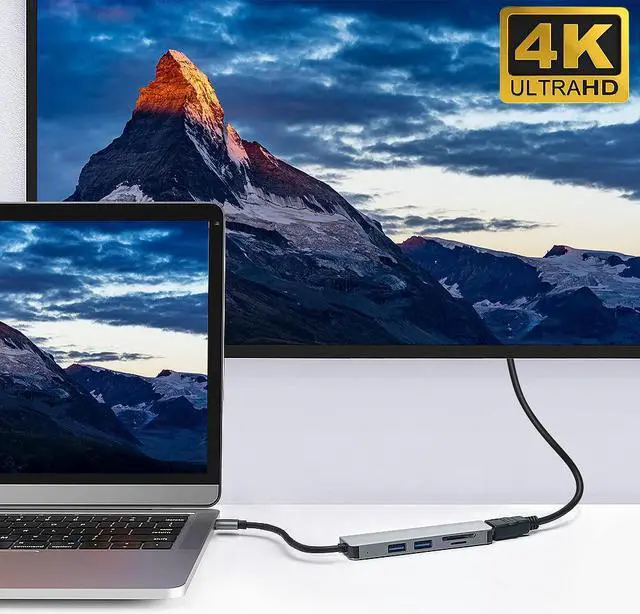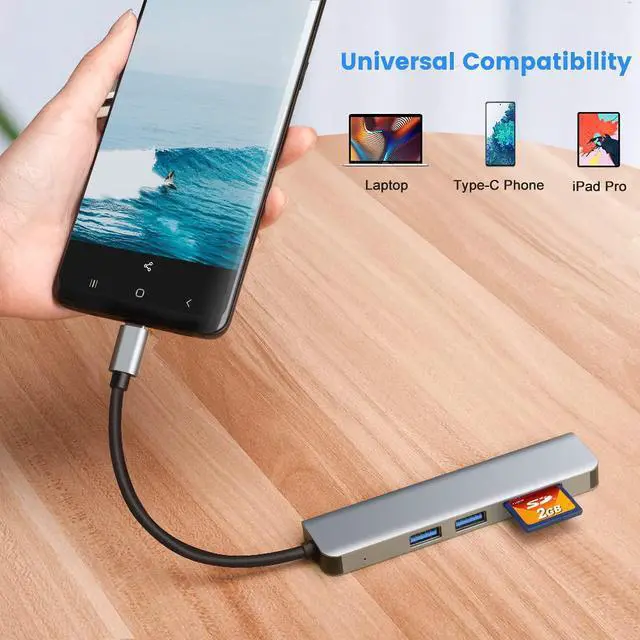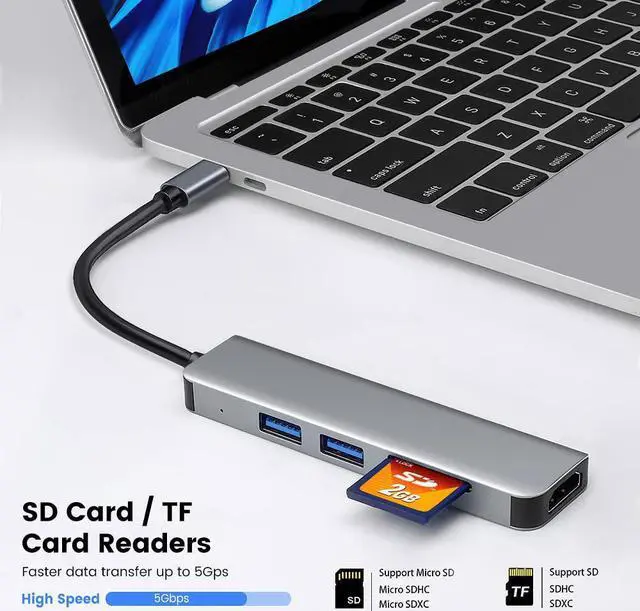 5 in 1 USB C HubThe 5-in-1 data hub splitter instantly expand your device's Type-C port with 5 functions, including 4K@60Hz HDMI output, SD card reader, TF card reader, USB 3.0 adapter and USB 2.0 adapter, bonus a blue LED light that visually indicate working status, improve efficient and keep an elegant workspace.