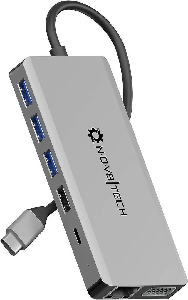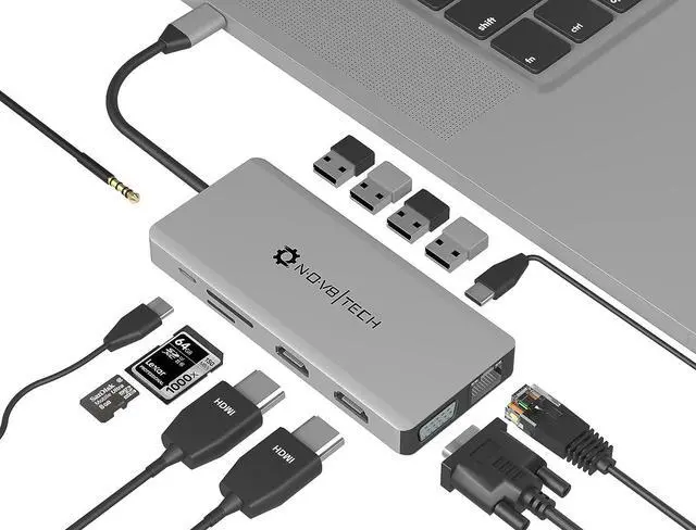 MASSIVE EXPANSION: The NOV8Tech 13-in-1 USB-C Hub adds 2x 4K HDMI, 1x 3.5mm Audio Jack, 1x Gigabit Ethernet, 3x USB 3.0 ports, 1x Micro SD/TF Card & 1x SD Card, 1x VGA, 1x USB 2.0, 1 USB C & 1 USB Type-C (power delivery); Plug-and-Play technology requires no driver or software installation IMPORTANT: Please connect the MacBook charger with the USB C Power Delivery port to utilize all ports of the hub.