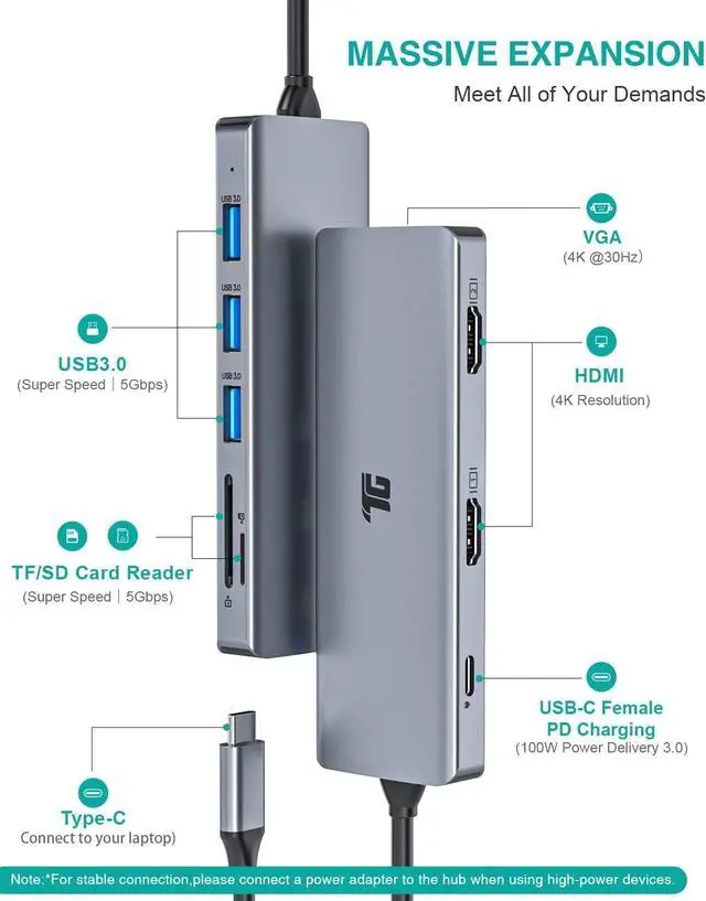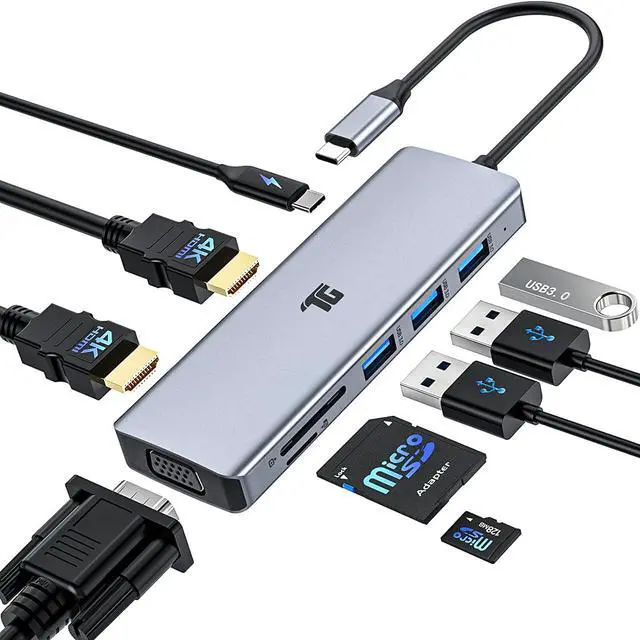 [Massive 9-in-1 USB C Hub] - Tiergrade Type C Hub turns a single USB C port into 9 ports to connect multiple devices, equips with 2 4K@30 HDMI, VGA, 3 USB3.0, Type-C PD 100W Charging Port and SD & TF card slot, greatly improve efficiency for your daily life and general work. No software and drivers are required, simply plug and play.