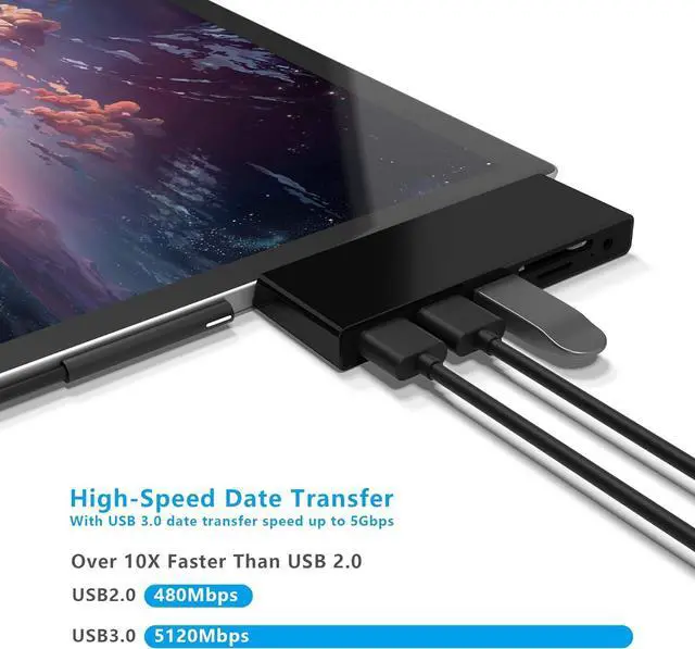 1x USB3.0 Port for Microsoft Surface Go/Surface Go 2/Surface Go 3 Docking Station supports super faster data transfer up to 5Gbps, 10X faster than USB 2.0.