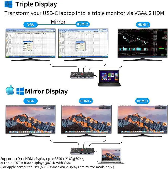 Ultra HD 4K Output and Triple Display]- Mirror or extend your screen with the HDMI port and directly stream 4K UHD or full HD 1080P video to HDTV, monitors, or projectors for a cinema-like visual feast. Triple display: one display of HDMI output, one display of another HDMI or Display port, one screen of laptop. Please note ONLY Windows system support MST, Mac OS DOES NOT support triple display