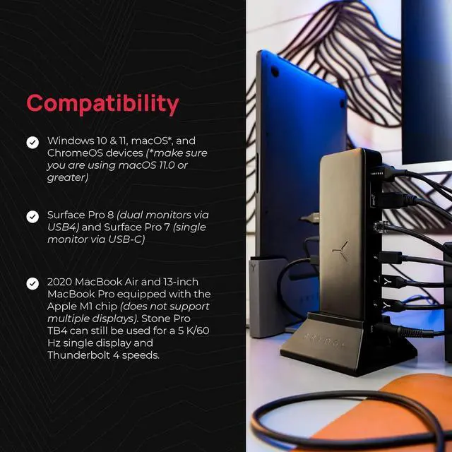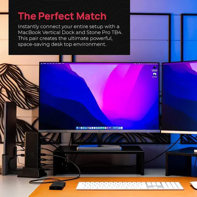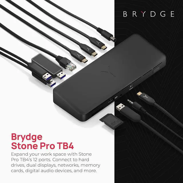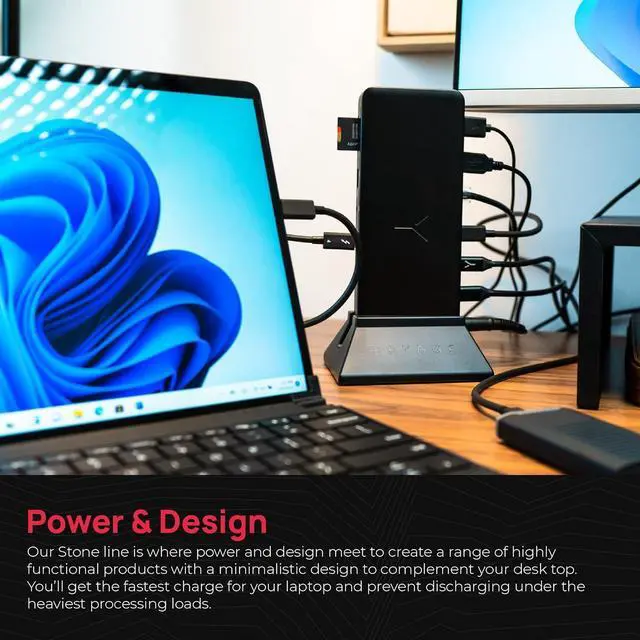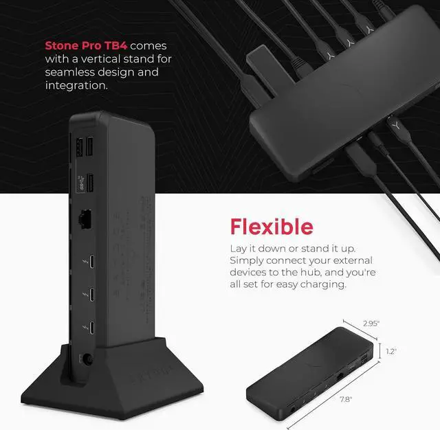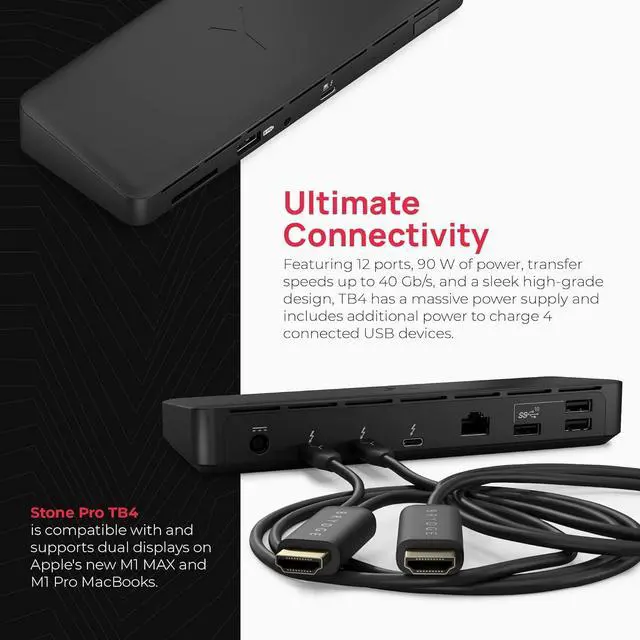 Stone Pro TB4 instantly connects all of your devices securely and manages the flow of connections in and out of your laptop. Create a refined desktop experience with dual display capabilities and Thunderboltâ?¢ 4 speeds. Featuring 12 ports, 90 watts of power, transfer speeds up to 40 Gb/s and a sleek high-grade design, the Stone Pro TB4 is the ultimate in connectivity.