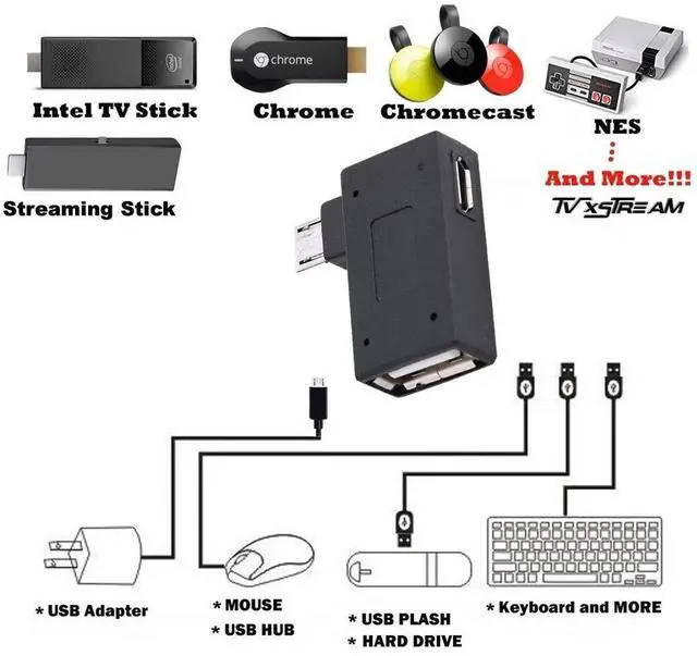 Transfer photos, videos, documents, Apps and other data between device and the external memory. (This OTG Cable will NOT charge phones or tablets but can power on streaming sticks)