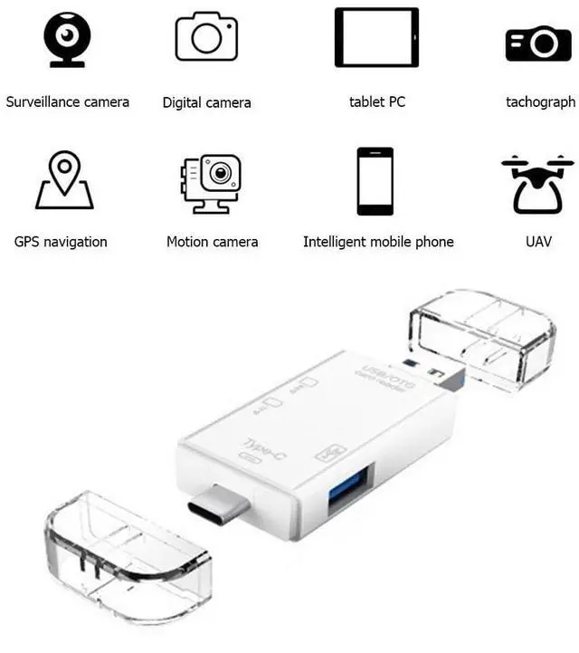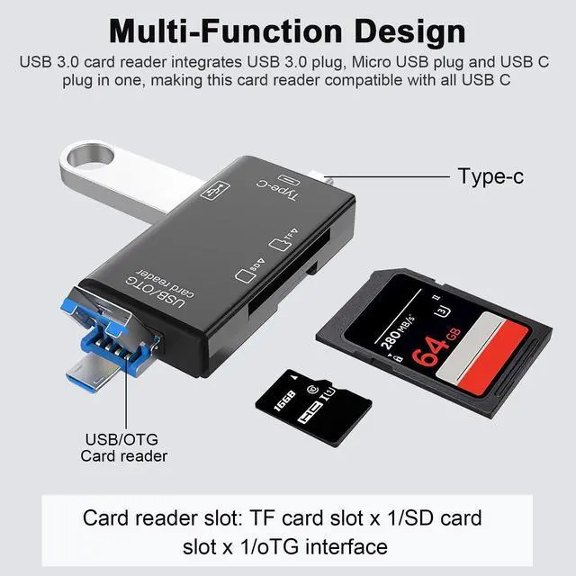 [Multi-Function Design] The USB 3.0 Card Reader set the USB 3.0 plug, Micro USB plug, and USB C plug in one, making this card reader compatible with all USB C devices and tablets and Android smartphones that support OTG function.[More Easily Read Most Memory Cards] USB 3.0 Card Reader for data transmission, manage all your data from/to/on devices and across multiple platforms (Create, copy, edit, move, delete, rename, Open in, and so on).