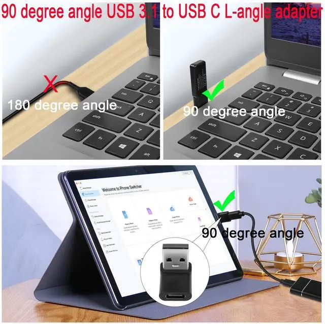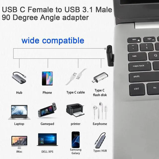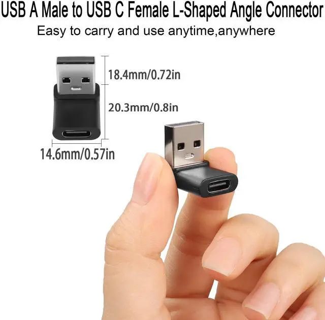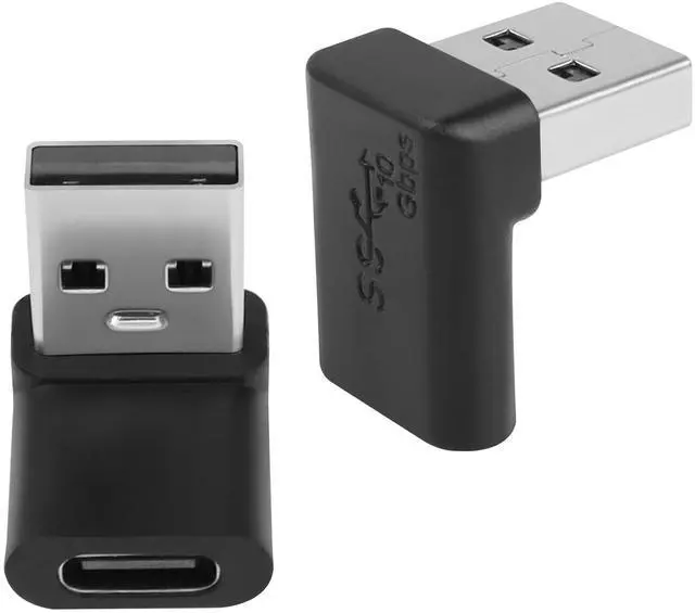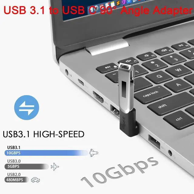 10Gbps USB 3.1 to USB C 90° angle L-shaped adapter.The "L" shape design with the female USB C connector up changes the cable routing for easy cabling in tight spaces. It can be left in the USB port without causing interference. Connects USB C devices such as USB C cables, USB C mice, USB C keyboards, etc. to USB ports of laptops/tablets/wall chargers. Data transfer up to 10Gbps, external high-capacity hard drive, easily copy large files. Exquisite and compact, does not take up space, carry it with you, plug and play.