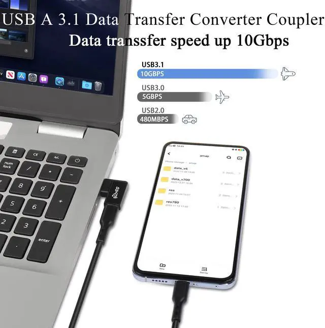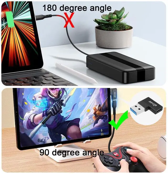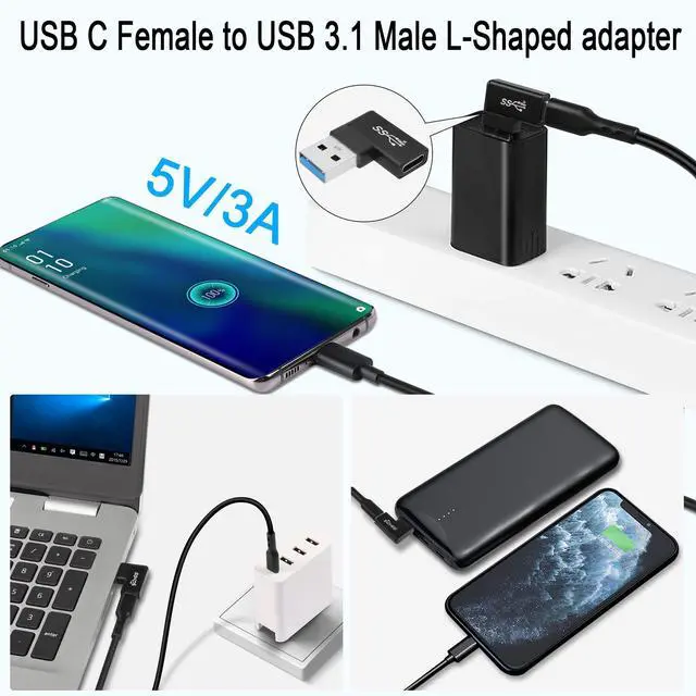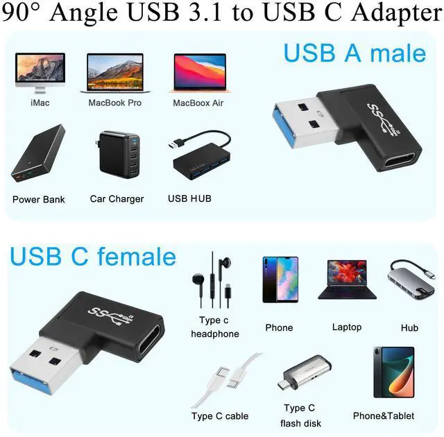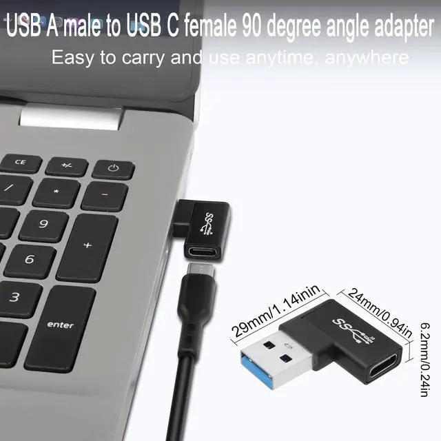 10Gbps 90° angle USB 3.1 to USB C right angle adapter. Make the cable fit tightly on your PC, laptop to avoid the cable from bending and bending, causing damage and extending the life of the cable. Connect USB C cables, USB C hubs, USB C mice, USB C keyboards and other USB C devices to USB ports of laptops/tablets/wall chargers. Support OTG expansion function, let your tablet easily external auxiliary devices, such as joystick, mouse, keyboard, etc. Aluminum alloy shell, plug and play, compact and portable.