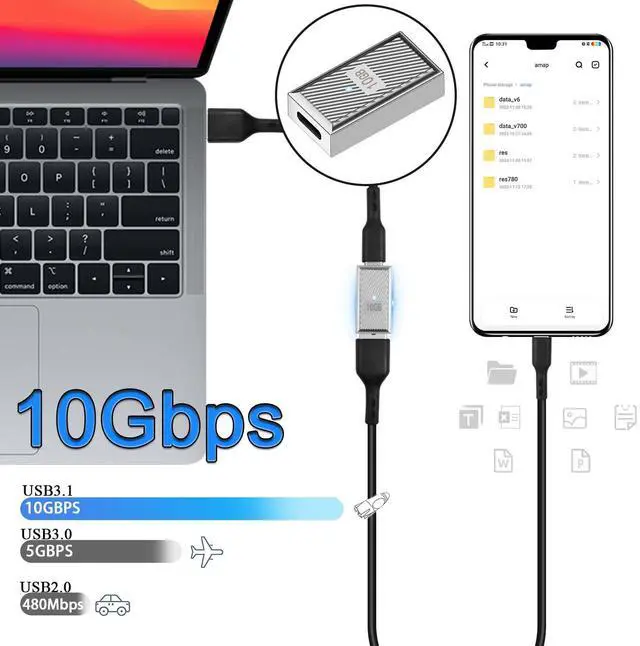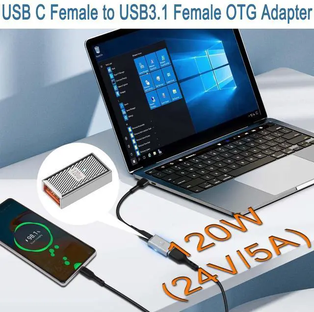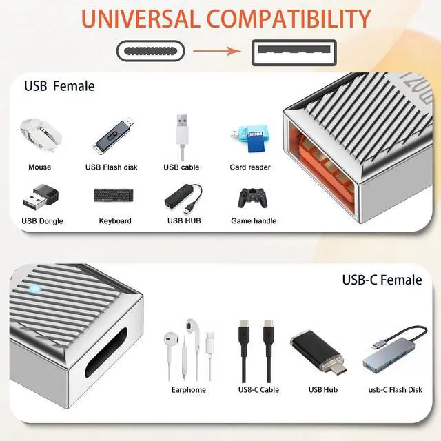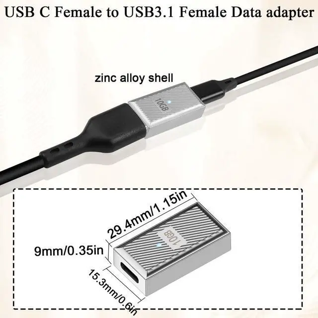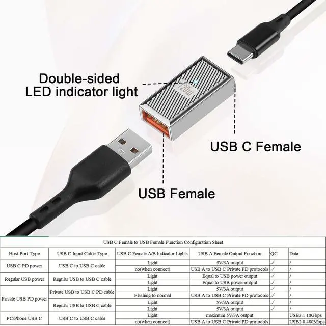 120W USB C Female to USB A 3.1 Female OTG data connector.For conversion or extension between USB A and USB C cables. Support OTG extension function, which can make your mobile phone, tablet, laptop, Switch, Steam Deck, game console, easy to external USB drive, joystick, mouse, keyboard and so on. Wear-resistant and pressure-resistant zinc alloy shell, stronger anti-oxidation and heat dissipation. Dual-sided LED indicators, light up when working.