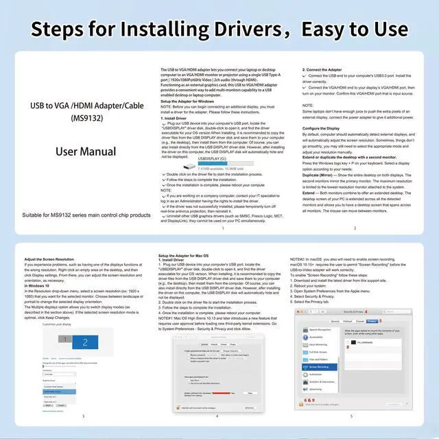 This adapter functions as a powerful HD extender for dual monitors, allowing you to connect two HD displays to your device via a single USB connection. Each HD port supports mirroring or extending your display at resolutions up to 1920x1080@60Hz, significantly boosting your productivity.