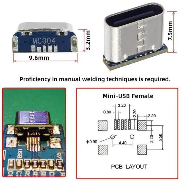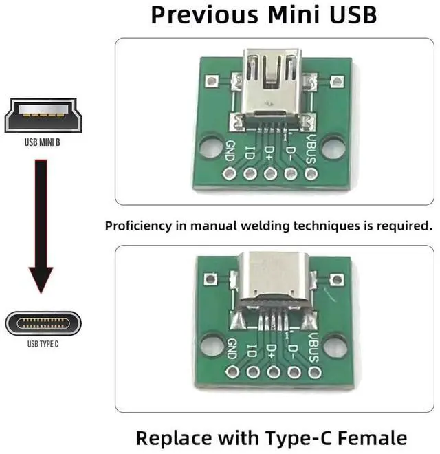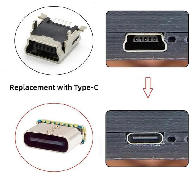 1) The Type-C female connector is replaced for Mini USB 5Pin Female; For DIY OEM solder use.
