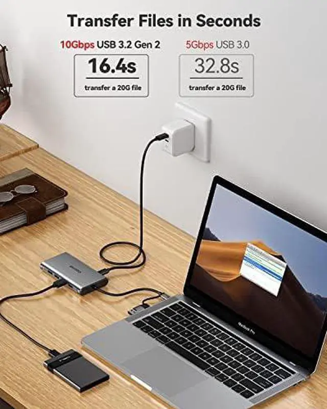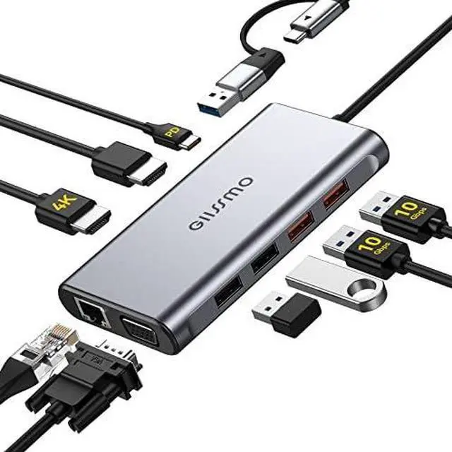 The USB C HUB Multiport Adapter includes 2*HDMI/VGA/2*USB2.0/2*USB 3.2 GEN2/RJ 45/USB-C (for the charge to dock only).