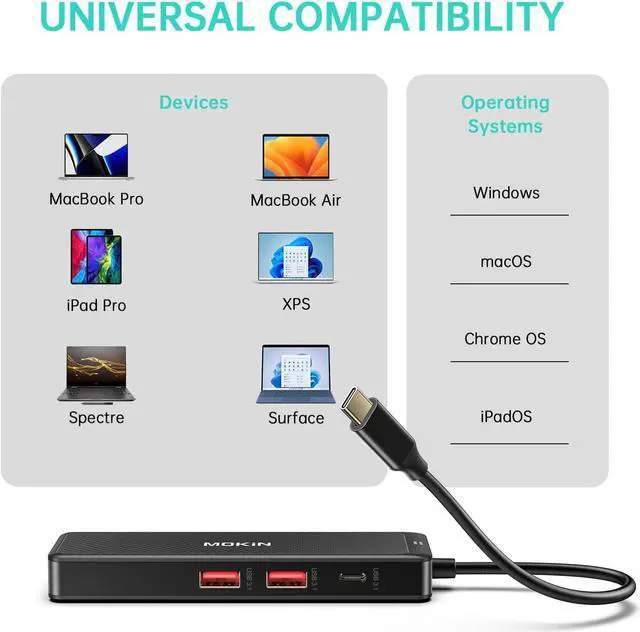 • MOKiN USB C Hub: 5 in 1 USB C Hub Multiport Adapter has 4K@60Hz HDMI port, Ethernet port, USB C 3.1 data port, 2 USB-A 3.1 data ports (up to 10Gbps), giving you an incredible range of functions\u2014all from a single USB-C port. (Please NOTE: USB C 3.1 Data Port NOT SUPPORT charging, only for the data transfer.)