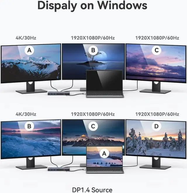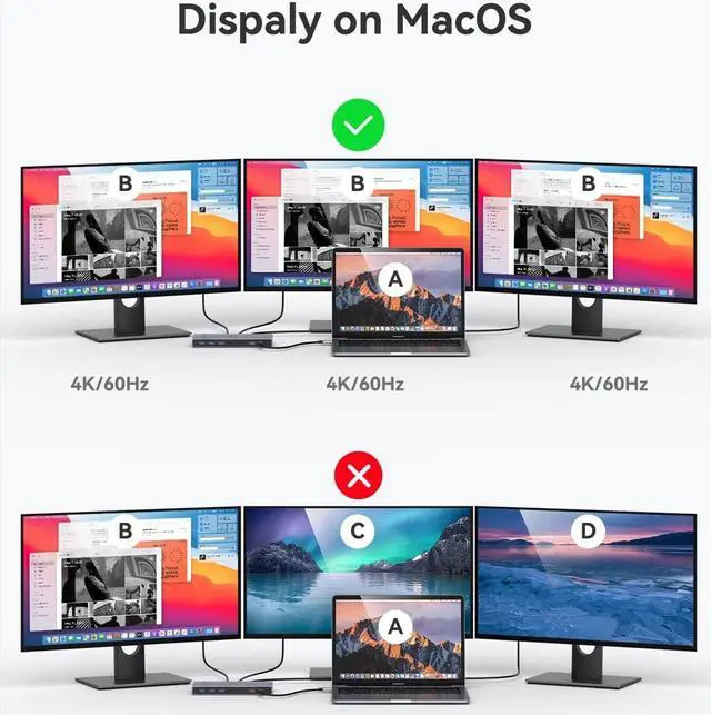 • Three 4K display portsCompared with the traditional dual hdmi docking station, it has dual DP (better performance for high-end displays) and 4K HDMI, both support up to 4K@60Hz output when connecting a single display.MacOS users can connect up to 3 monitors up to 4K@60Hz (DP1.4), but for MacBooks with M1 or M2 chips, only 1 monitor can be connected. Note: Due to the limitation of MacOS system itself, the screen display of all external monitors are the same.