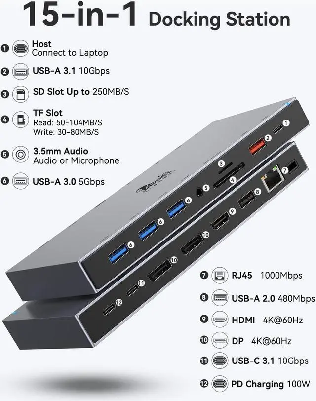 USB C Docking Station Dual DisplayPort, 15 in 1 Triple Display Docking Station 2DP+HDMI,10Gbps USB A/C 3.1 Port, Ethernet,3USB3.0+USB2.0,100W PD,Audio/mic,SD/TF for MacBook/Dell/Lenovo/HP
