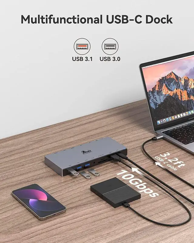 • 10Gbps USB 3.1 & Gigabit EthernetThe usb c docking station with USB 3.1 port ensures you can