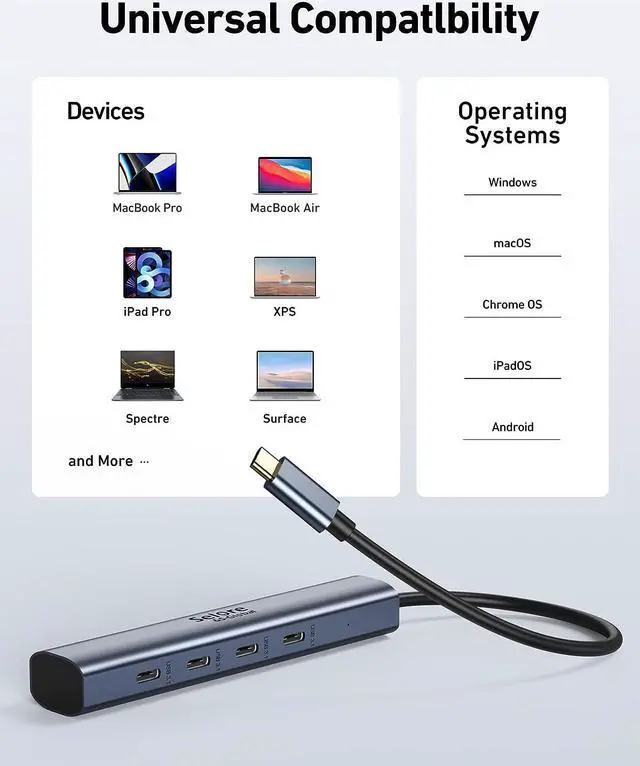 • Plug and PlayUSB C Splitter multiport adapter can be connected to laptops, mobile phones, tablets, etc. The usb-c hub splitter is compatible with all devices with usb c port expander hub, No additional drivers are needed. Compatible with MacBook Pro, MacBook Air, Mac OS, Windows, Linux, Chrome OS, iPad OS, Android.