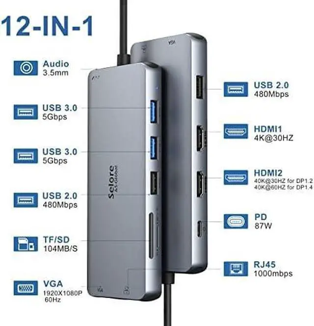 • [12 in 1 USB C Docking Station]:This dual monitor docking station contains 2* 4K HDMI port, 2*USB 2.0, 2*USB 3.0, USB C PD Charging, VGA, SD/TF Card Reader slot, 1000M Gigabit Ethernet RJ45 port, and Audio/Mic 2-in-1 port. All the ports of this docking station can be in use simultaneously, allowing you easily connect the keyboard, mouse, USB driver, external Disk to your laptop. Efficiently meet all your working and entertaining needs.